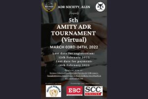 The ADR Society of Amity Law School Noida is pleased to announce the fifth edition of the prestigious Amity National Alternative Dispute Redressal Tournament 2022 , scheduled on 3rd – 4th March 2022. This event would be a great opportunity for all law students (Currently pursuing a five-year integrated course, three-year LLB or LLM).